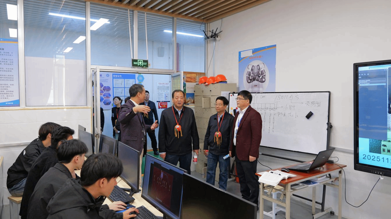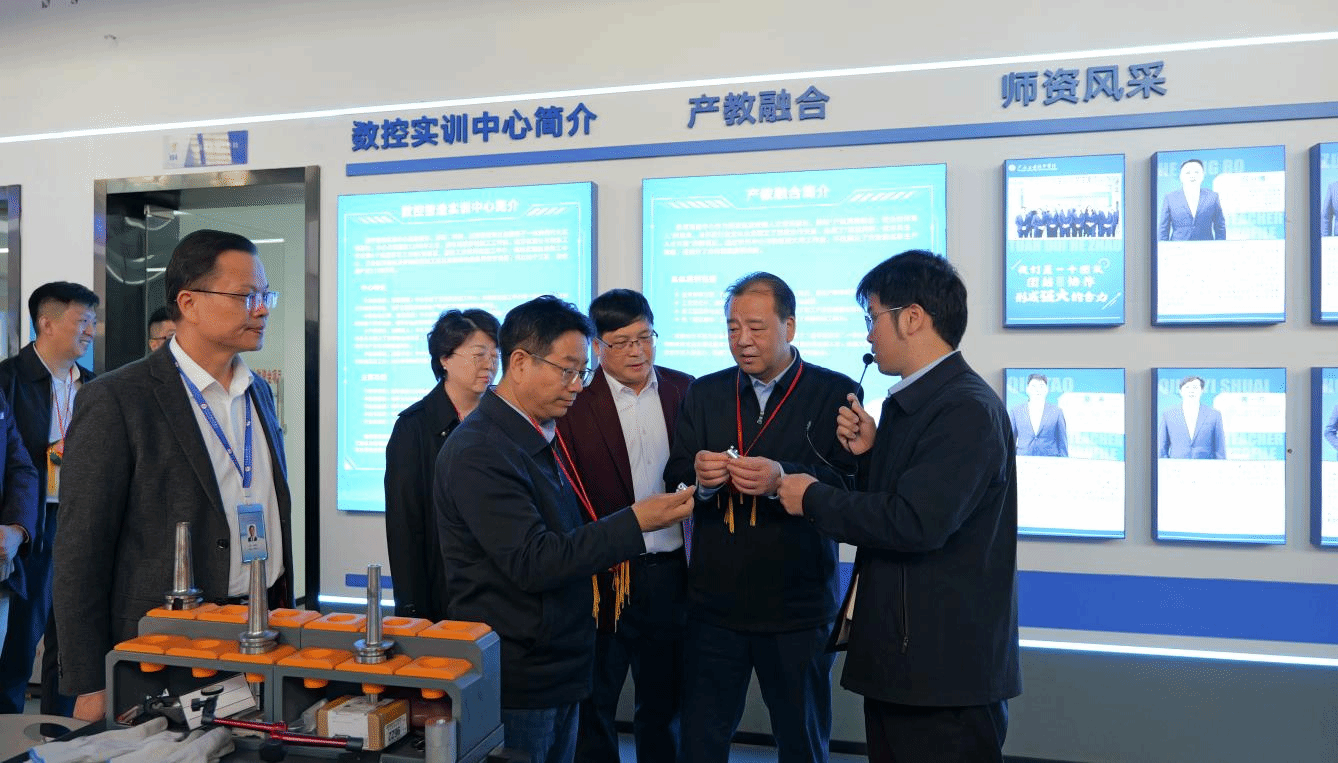 11月20日,在广西工业技师学院数控实训中心,我校校友、该校智能制造与装备产业系主任黄炳祥为张金刚一行作讲解
